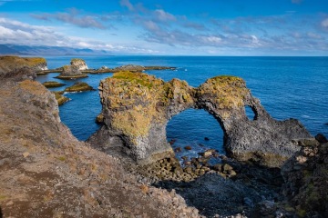 Poloostrov Snaefellsjökull se stejnojmeným národním parkem ukrývá nejfotografovanější záběr Islandu. Překrásný vodopád Kirkjufellsfoss s horou Kirkjufell v pozadí. Je zde ovšem i krásné rozeklané pobřeží plné skalních mostů a majáků. Jeden z nejhezčích úseků je mezi Hellnarem a Arnarstapi. V posledním jmenovaném je kromě sochy zdejšího patrona, někoho jako náš Krakonoš, také velmi příjemný kemp. Láva v tomto národním parku v dávné historii překryla ledovec, který pod ní díky teplu roztál a vzniklo množství podzemních dutin a prostorů, proto je zde velmi nebezpečné chodit mimo vyšlapané pěšiny, protože hrozí propadnutí. Jedna z podzemních prostor je skutečně velká a dnes přístupná jako Vatnshellir Cave. V pokladně, stejně jako na mnoha jiných místech, obsluhovala slečna z Čech, a tak i výklad posléze byl v rodné řeči, a ne v angličtině, která na Islandu poslouží skvěle a mluví jí skutečně každý.
